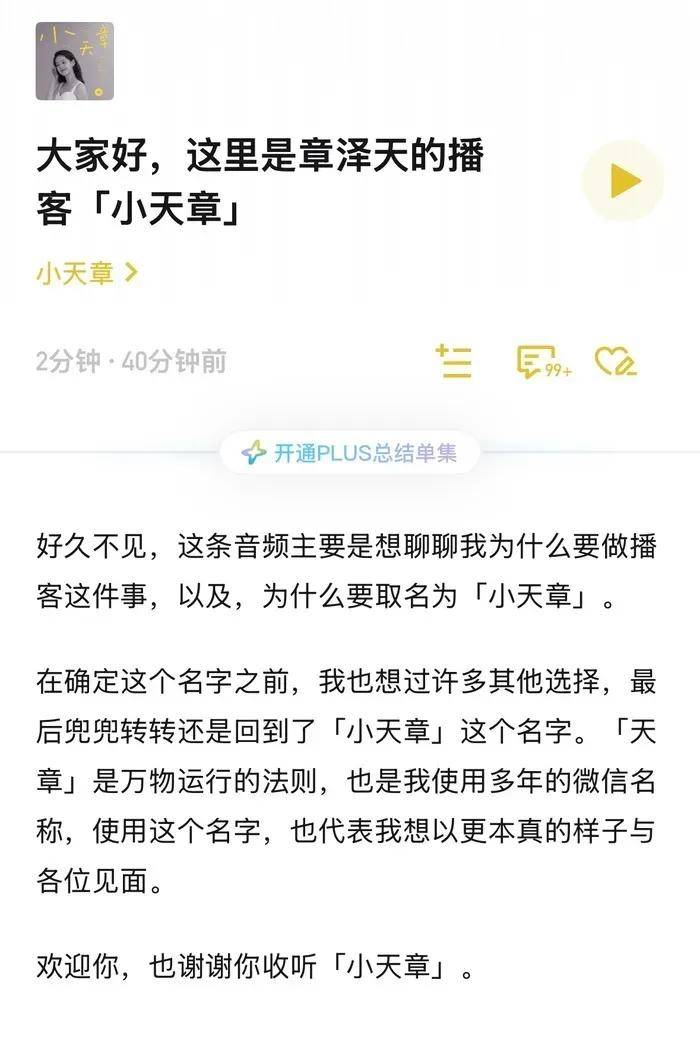 为何选择在这个时段“杀”进播客赛道,在首条时长2分钟的播客中,章泽天阐释了几点原因: