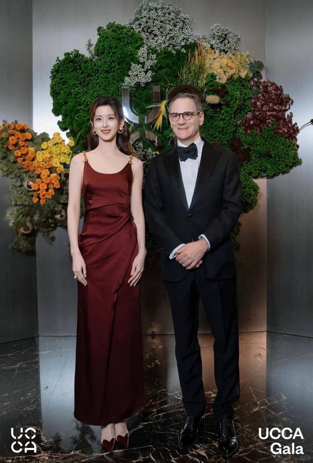 2025年11月,章泽天以UCCA尤伦斯艺术基金会理事身份出席UCCA Gala艺术慈善晚宴,一袭来自Schiaparelli的酒红色缎面吊带长裙搭配金色耳饰,明艳动人。