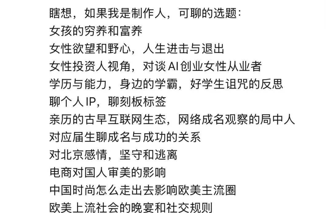 对于章泽天之后的播客选题,网友给了不少建议,认为她完全没必要探讨“天地运行的章程”如此高深莫测的博士论文级选题,敞开了聊聊婚姻中的磨合、带孩子的琐碎、创业的艰难等小切口、接地气的话题,就能引发网友的共鸣。还有热心网友给章泽天列了选题List,每一个听上去都很有点,就是不知道章泽天是不是真的能放下“面子”,玩得起、讲得出?