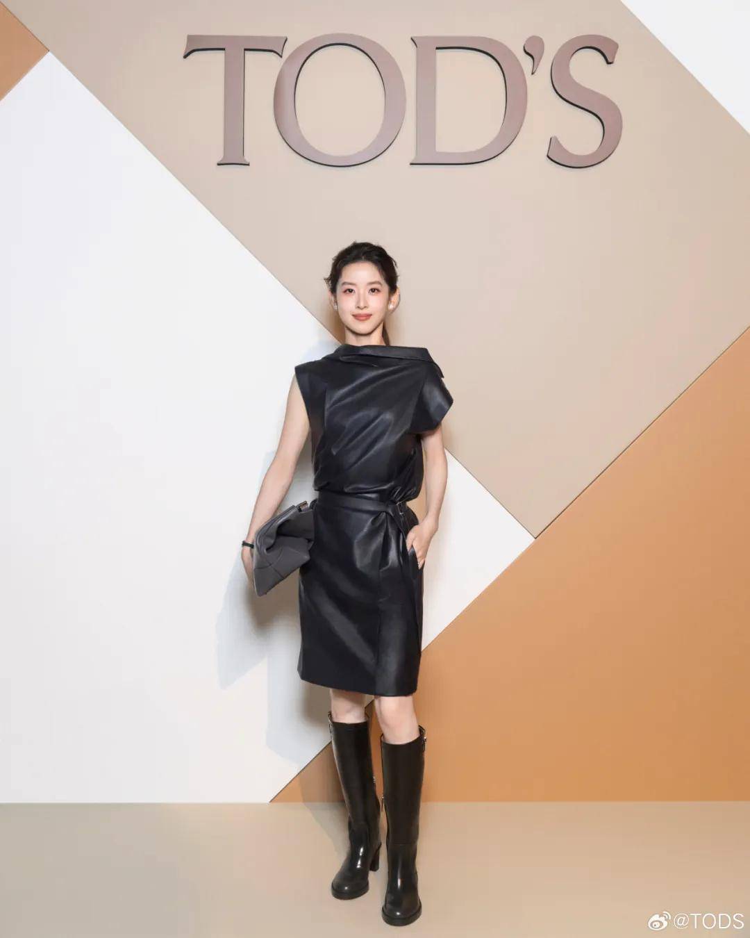 2025年10月,章泽天在伦敦出席全球顶尖艺术展会——Frieze艺术展。身穿来自 Alaia的咖色高领紧身衣搭配同品牌分层不对称迷你裙,脚踩她代言的TODS黑色长筒骑士靴,头发轻轻挽起,非常优雅知性。
