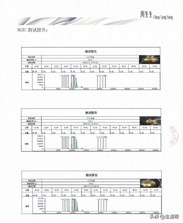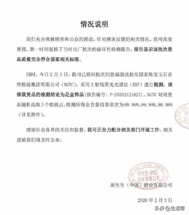 同时,今日2月3日,我司已将同批次同款福袋送检至国家珠宝玉石首饰检验集团有限公司(NGTC),采用X射线荧光光谱法(XRF)进行检测,该福袋货品的检测结论为足金饰品(报告编号:P-ZSSA2121621)。NGTC对该货品随机选取3个检测点,检测所得金含量结果依次为99.99%、99.99%、99.98%(详见附件)。