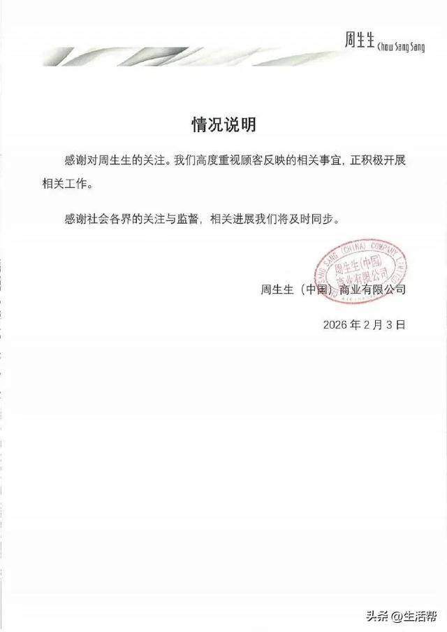 记者就此向品牌方问询,周生生回复表示品牌高度重视顾客反映的相关事宜,正积极配合政府相关部门开展工作,全力推动事件早日圆满解决,也感谢社会各界的关注与监督,相关进展会及时同步。