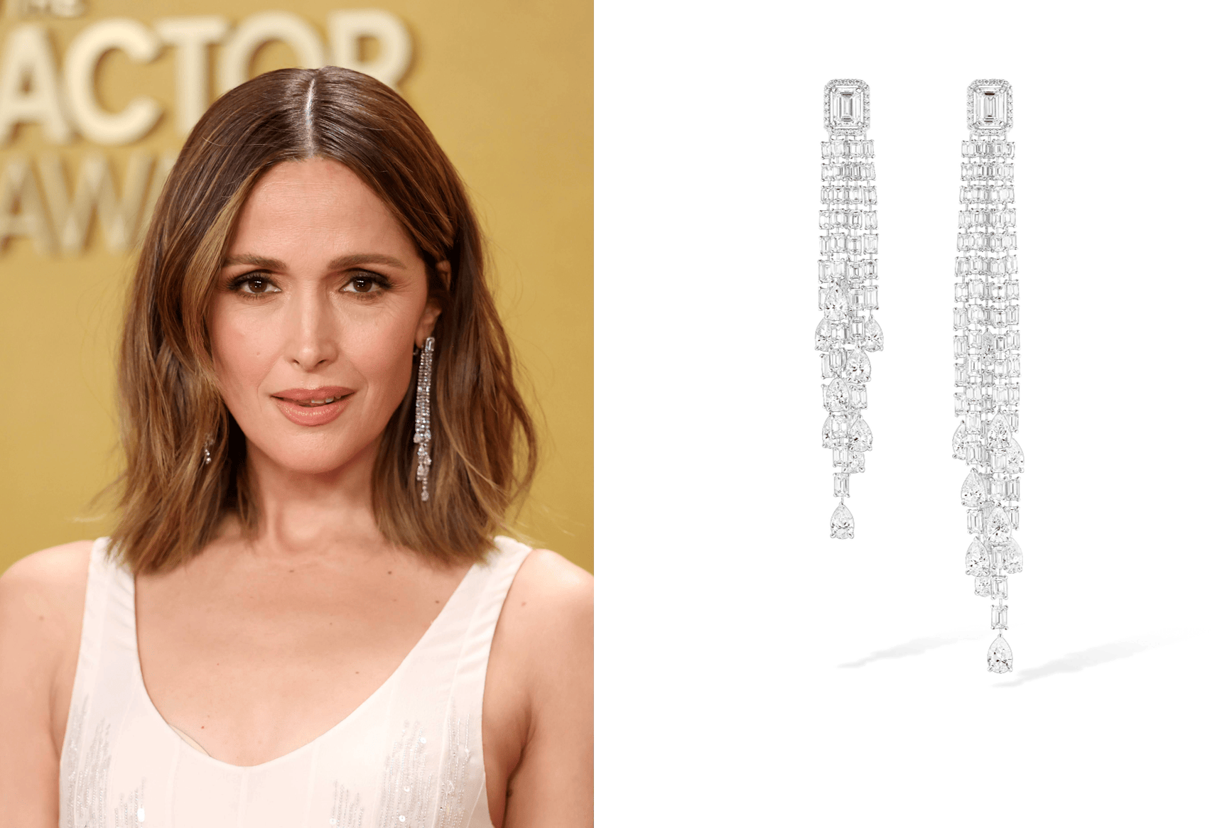 左:萝丝·拜恩(Rose Byrne)佩戴法国高级珠宝品牌Messika的天然钻石珠宝作品亮相第32届美国演员奖;右:Messika Sirenetta耳环