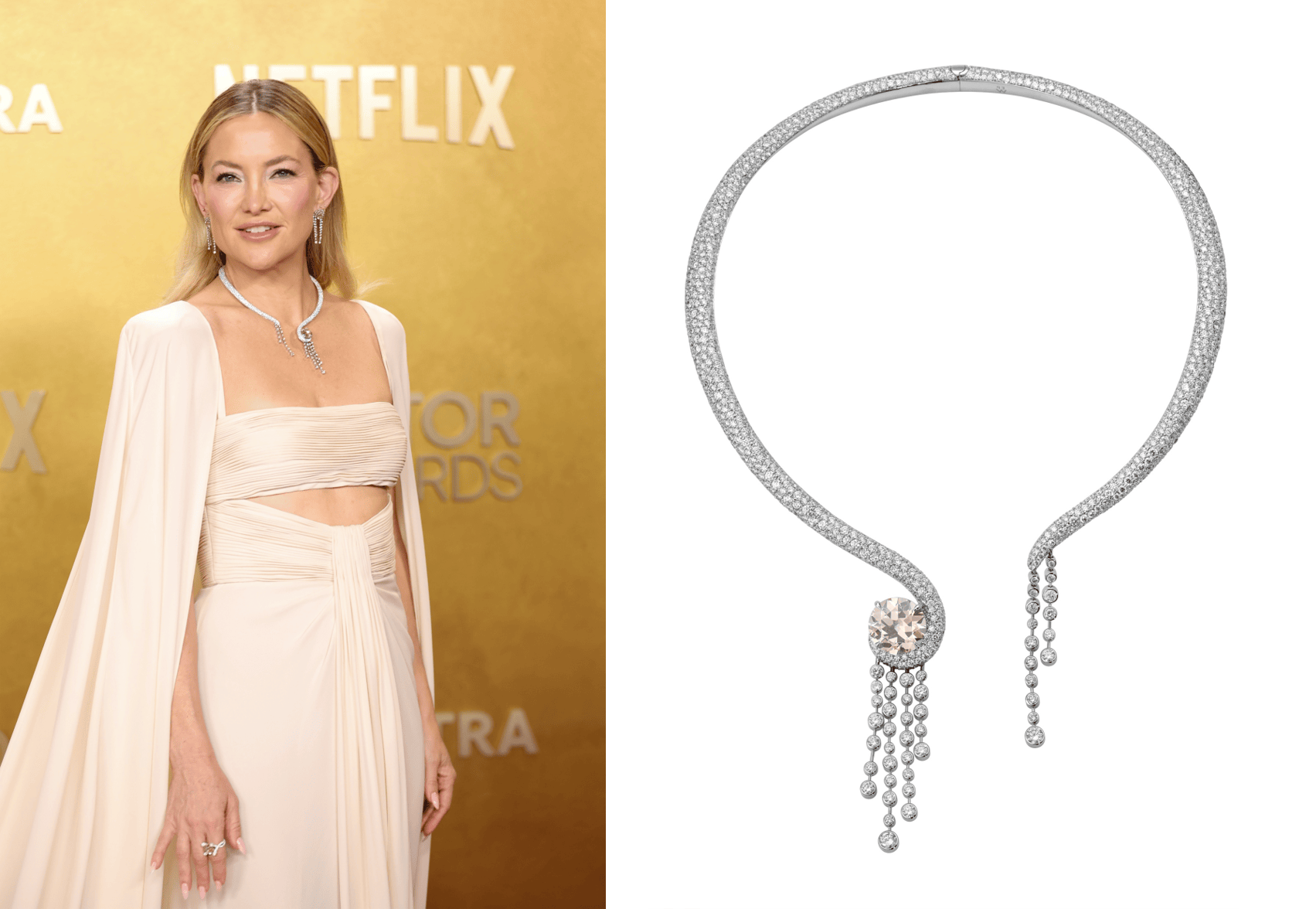凯特·哈德森(Kate Hudson)选择了一套源自Emily P. Wheeler的定制珠宝。其中最引人注目的是一条开放式扭矩项链,中央镶嵌着一颗色泽温润的浅干邑色沙漠钻石,指间则点缀着两枚设计大胆的气泡造型戒指,其主石均为产自博茨瓦纳的沙漠钻石。此外,她还佩戴了一枚品牌标志性“扭纹”系列的戒指,该作品经匠心独运地重新演绎,以东西朝向镶嵌着一颗干邑色马眼形切割钻石。最后,一副以浅干邑色沙漠钻石为主石的气泡流苏耳环璀璨点缀,为整体造型画上了点睛之笔。
