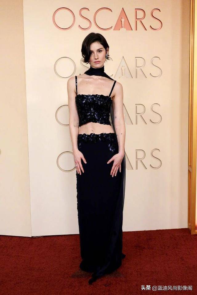 同色系的海军蓝薄纱围巾绕颈而成的高领设计,更是整套造型的点睛之笔 —— 它与抹胸上衣形成了巧妙的露肤平衡,为性感的剪裁注入了法式优雅的克制与疏离,恰好放大了 Gracie Abrams 骨子里的清冷气质,让整体造型在优雅之外,多了几分独属于她的文艺与神秘。