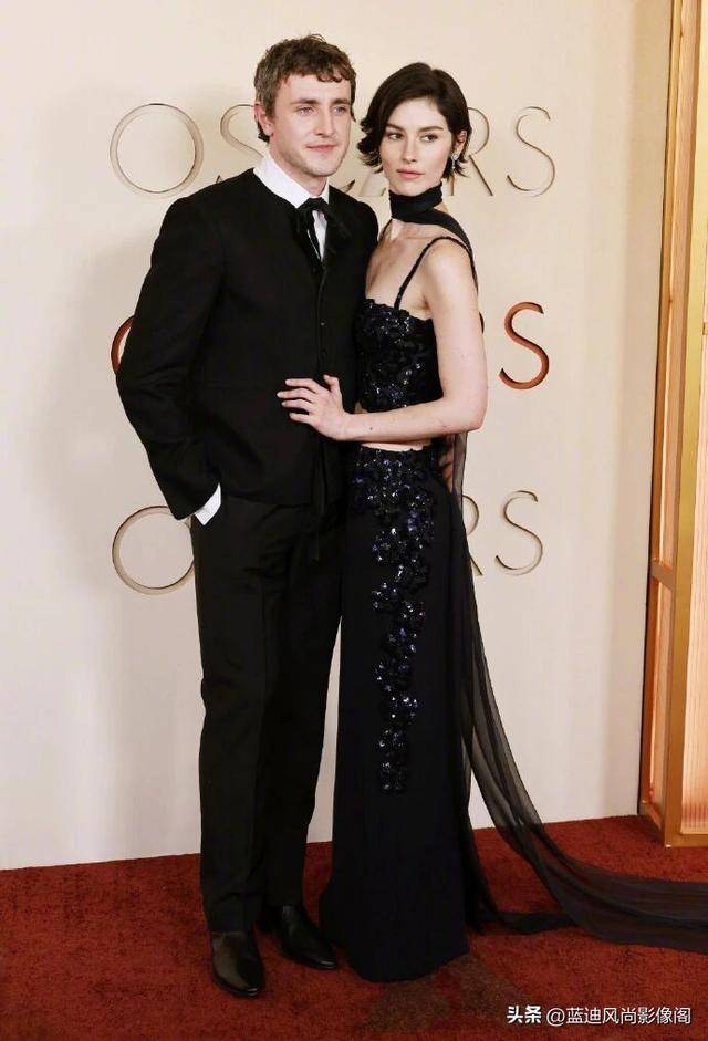 当晚最让人眼前一亮的,还有她与男友 Paul Mescal 的甜蜜同框。两人不约而同地选择了黑色系造型,Gracie 的 CHANEL 黑裙清冷优雅,Paul 的黑色西装沉稳绅士,并肩而立的画面,默契感与氛围感拉满,没有刻意的秀恩爱,却在相视一笑、贴身相依的细节里,藏不住的甜蜜,成为了奥斯卡之夜难得的养眼情侣名场面。