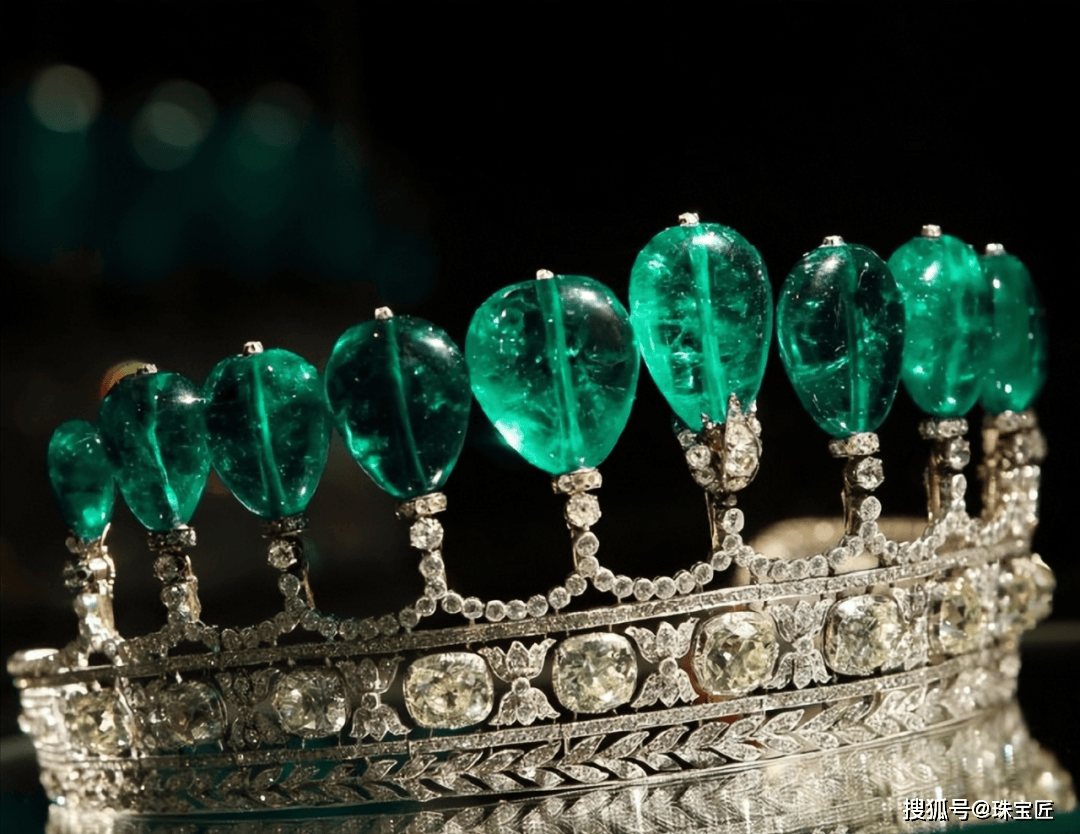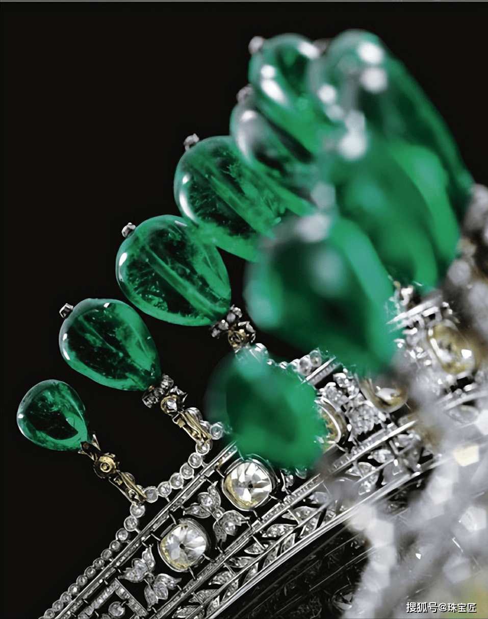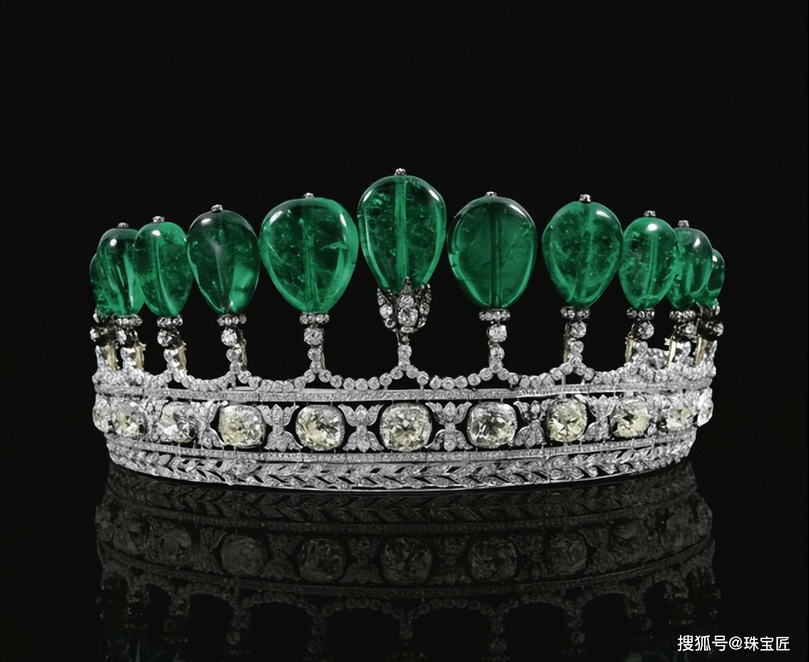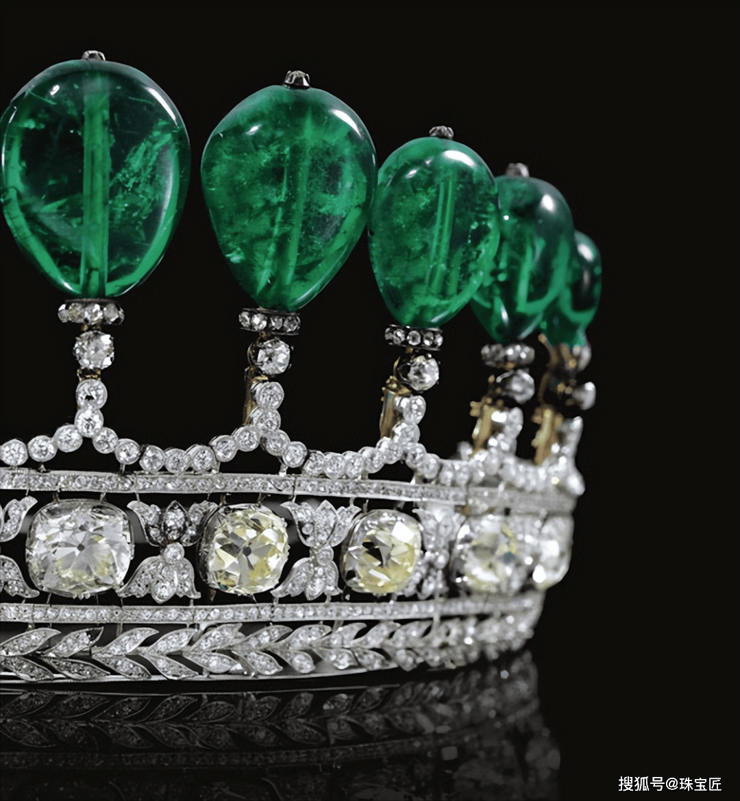 这顶祖母绿冠冕的上方,共镶嵌有11颗总重高达500克拉、产自哥伦比亚的祖母绿,这些祖母绿可单独拆下,下方则是由大小不一的钻石镶嵌而成,这大概就是只要主石够大,随便镶一下都好看的最佳诠释了~