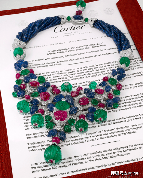 这条印度风格的“TUTTI-FRUTTI”项链,卡地亚匠人们用了超过3000小时制作而成,蓝宝石、红宝石、祖母绿被雕刻或镌刻成叶子、花蕾、莓果的形状,配色鲜艳明亮,造型独一无二,彰显华丽气质。
