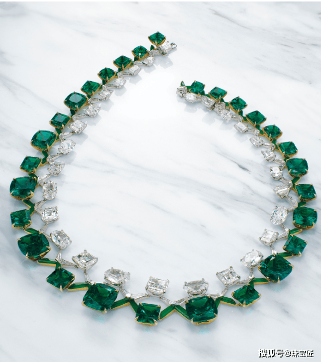 能够将众多尺寸惊人、品质卓绝的天然祖母绿汇集于一件作品之中,已是难能可贵,再辅以钻石的璀璨映衬,令这条祖母绿项链当之无愧地成为珠宝史上的一件珍品。
