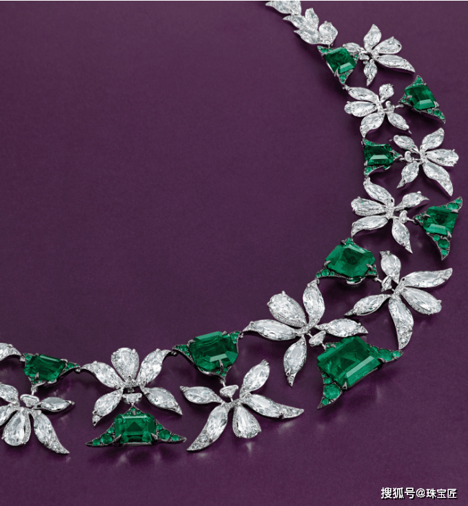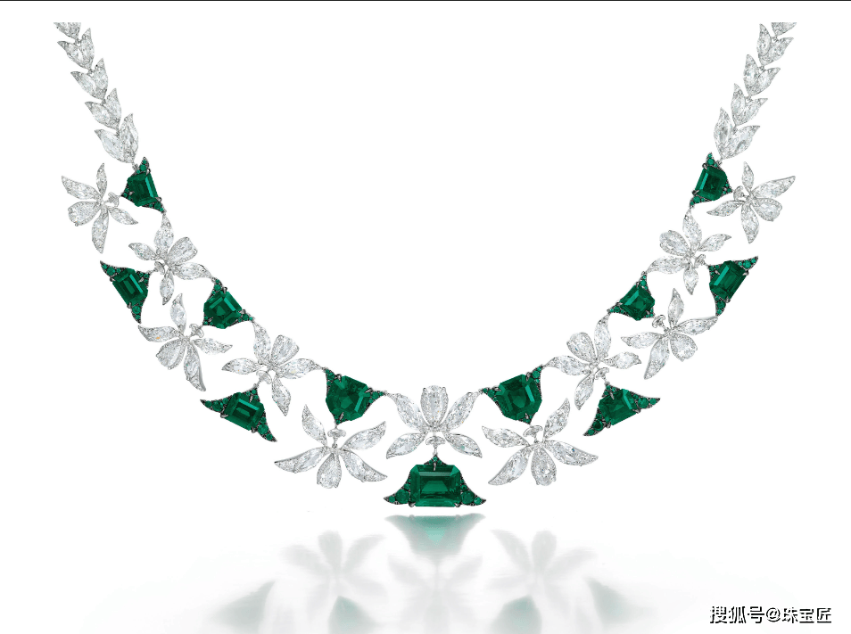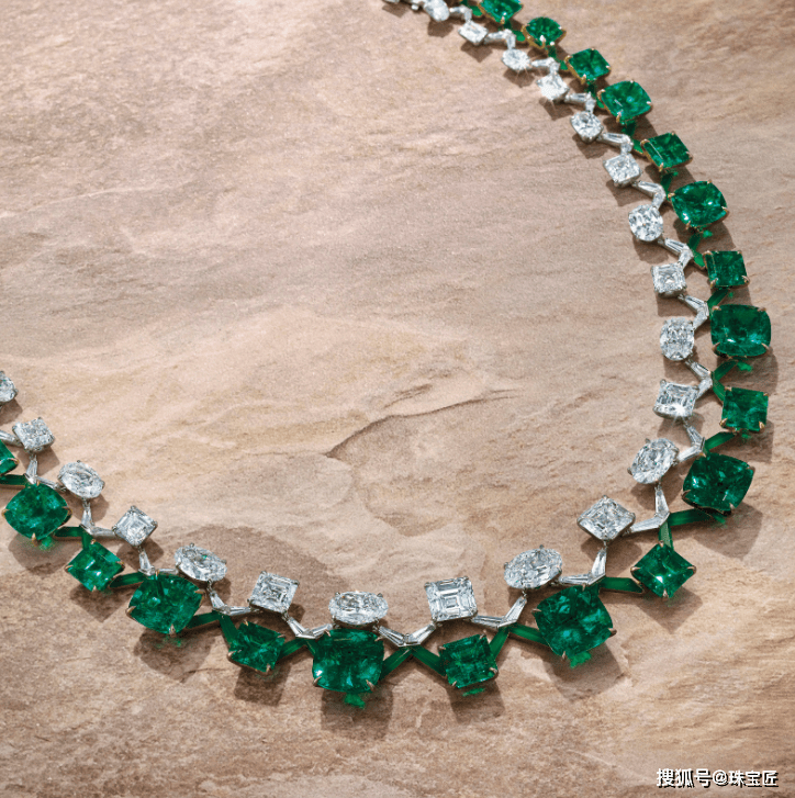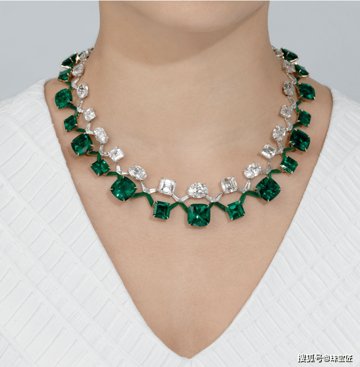 项链上共镶嵌了12颗总重约108.74克拉的六边形及祖母绿切祖母绿,均产自哥伦比亚,其中8颗经过微油优化,4颗为完全天然未经任何处理,极为珍罕。
