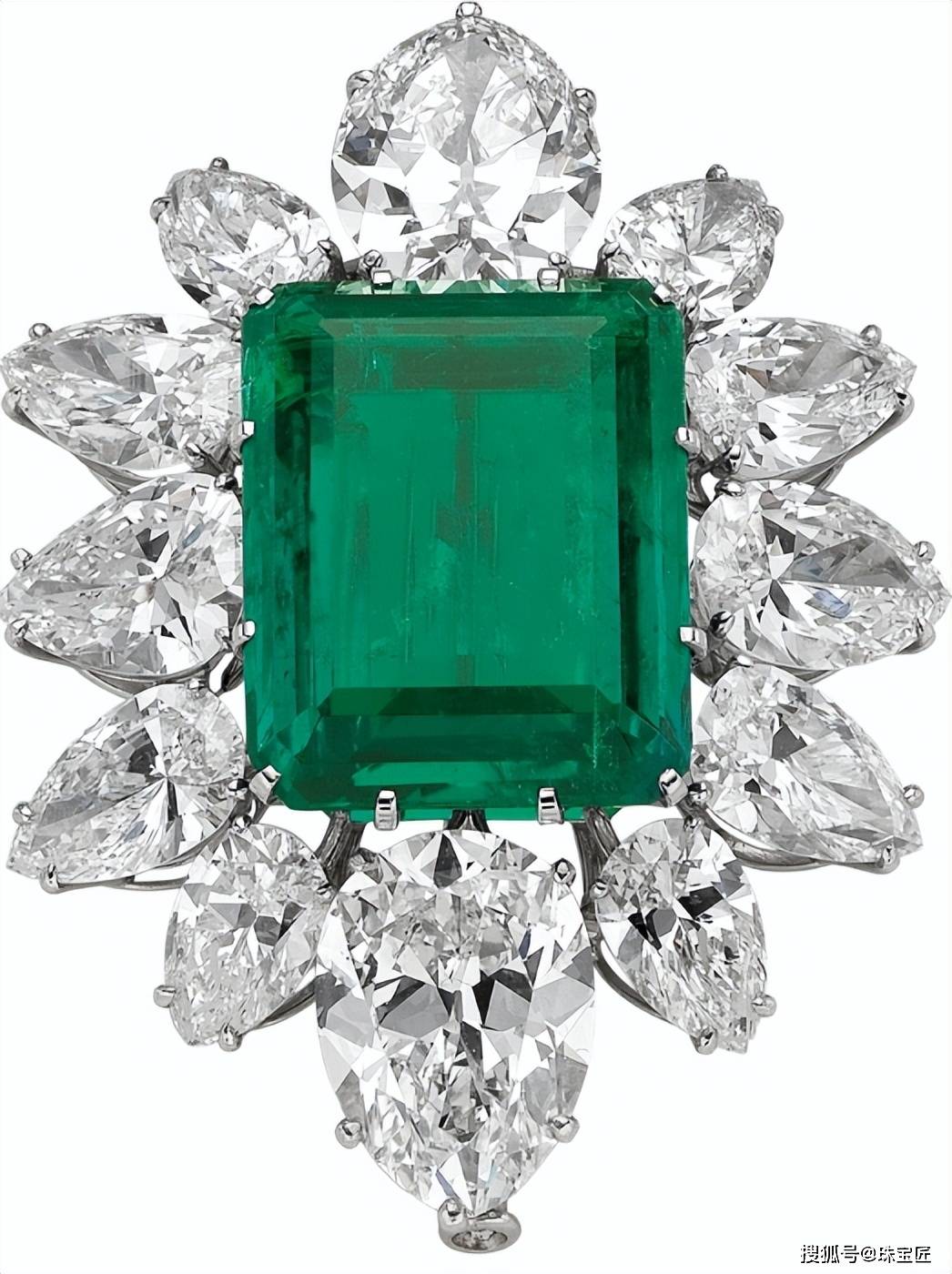 阿迦汗祖母绿钻石胸针,主石是一枚重达37克拉的祖母绿,原产于哥伦比亚木佐矿区。