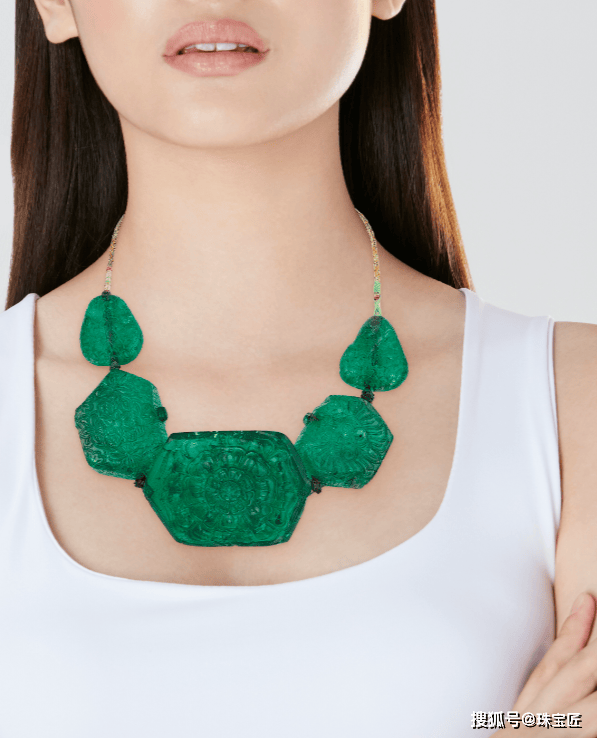 项链的一侧点缀一颗294克拉六角形祖母绿和一枚108.50克拉梨形祖母绿,一侧点缀有一颗199.50克拉的六边形祖母绿和106.50克拉的梨形祖母绿,这些祖母绿均产自于哥伦比亚,经过注油处理,雕刻有印度风情的花卉纹样。