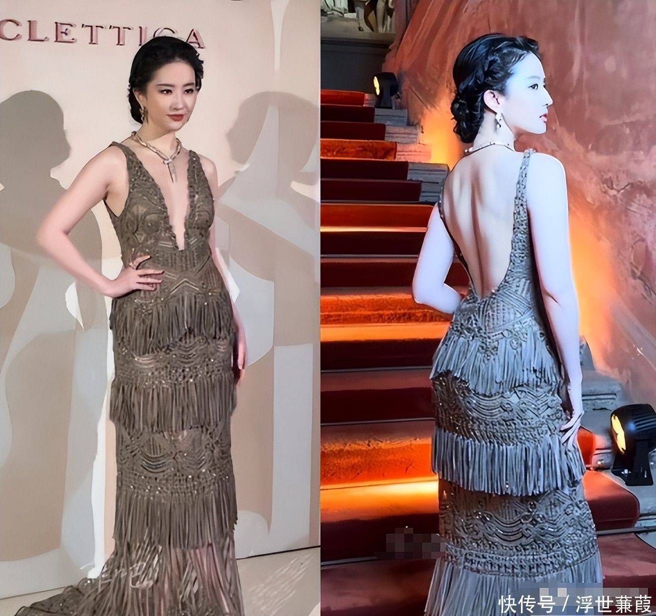 整条礼服剪裁极具张力:深V领口勾勒修长颈线,腰际开衩搭配大面积露背设计尽显优雅力量感,裙摆垂坠的金属流苏随步伐轻盈律动,每一步都似流动的光影诗篇。