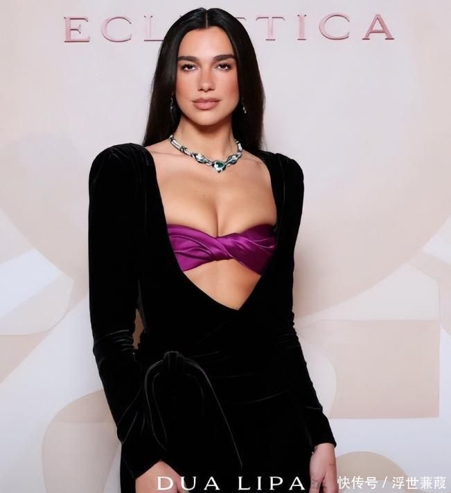 Dua Lipa一袭黑色丝绒吊带长裙搭配内衣外穿造型,身材曲线鲜明吸睛,风格张扬热烈,却与珠宝展所倡导的典雅静谧氛围形成微妙错位。
