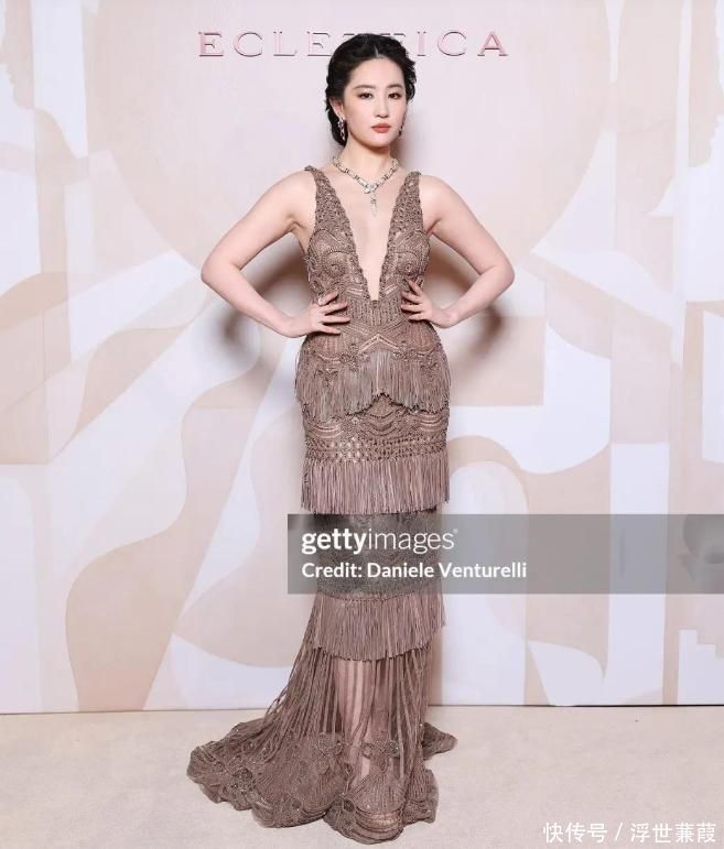 她身着Elie Saab 2026早春高定系列咖啡色镂空流苏长裙,成为该套设计在全球范围内的首位演绎者。