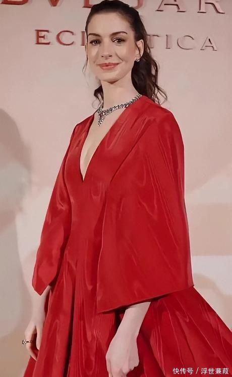 安妮·海瑟薇选择正红色深V丝绒长裙,发型利落高束,44岁的状态紧致饱满、神采奕奕,但整体视觉张力与情绪感染力略逊于刘亦菲所呈现的复合型魅力。