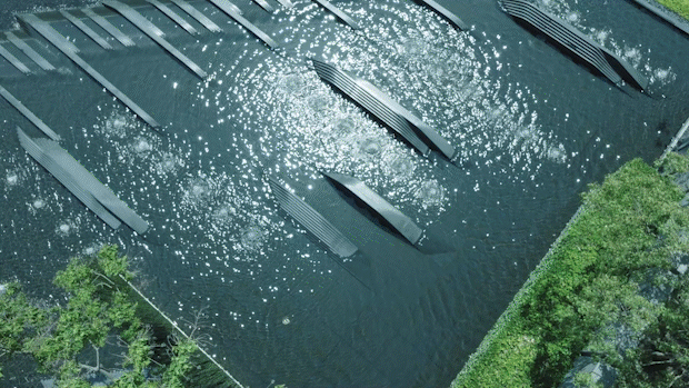 常规项目建筑与自然有割裂感,而项目主打“融合”,当刚开始参观项目时,映入眼帘的并非那些习以为常的高耸围墙和大门,而是林下独特的空间氛围和气势磅礴的线性水景。
