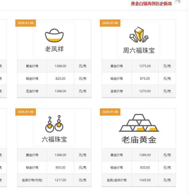 1月6日,记者走访各品牌金店发现,周六福、老庙黄金、老凤祥的足金饰报价分别为:1375元/克、1389元/克、1388元/克,各主要黄金品牌价格日均涨幅超12元,金价集体站至1375元/克以上。