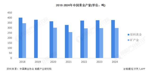 2024年中国黄金产量达377.24吨,占全球总产量10%,远超第二名俄罗斯和第三名澳大利亚。