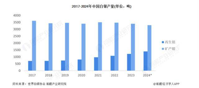 据世界白银协会统计, 2024年中国矿产银3300吨,较上年下降约一百吨,而再生银产量规模近年来呈不断上涨趋势,从2017年的709吨升至2023年的1221吨。