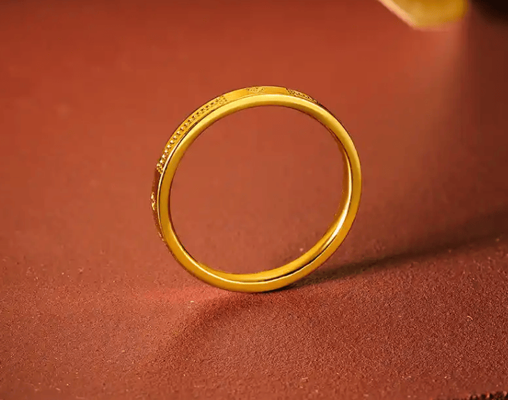 其中一套“同心相依”情侣黄金饰,瞬间抓住了我们的目光。男生款是简约的素圈戒指,边缘刻着细碎的纹路,低调又大气,上手利落干练;女生款是细巧的戒指搭配小巧的吊坠,戒指与男生款呼应,吊坠是爱心缠绕的造型,精致又灵动,既寓意着“同心同德、彼此相依”,又贴合我们的审美,日常佩戴既舒适又不突兀,还能彰显我们的情侣身份,瞬间就戳中了我们。